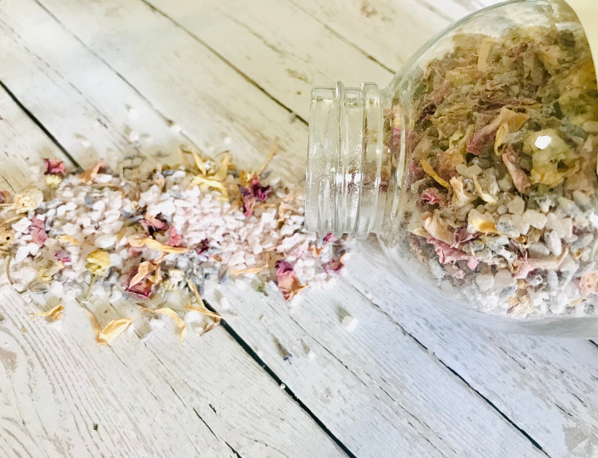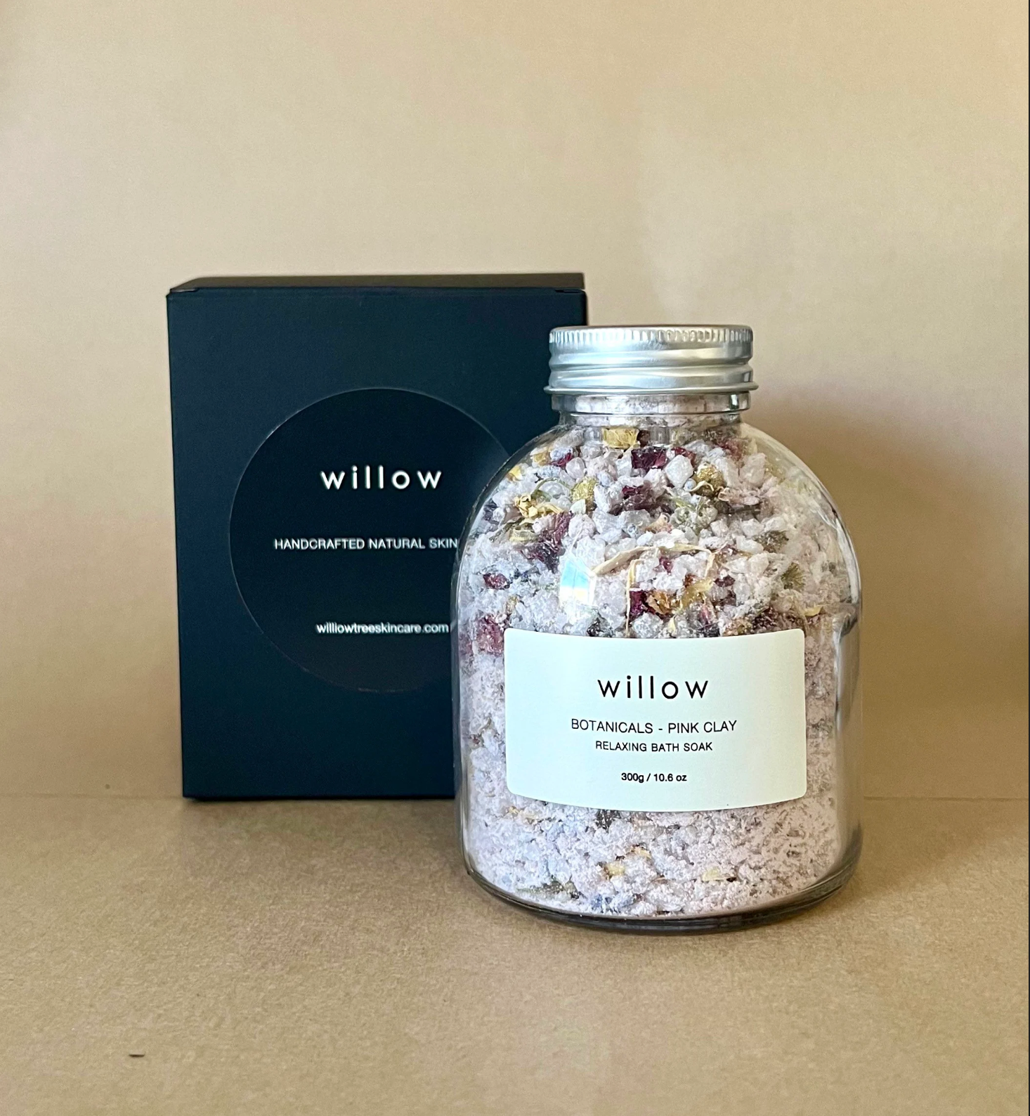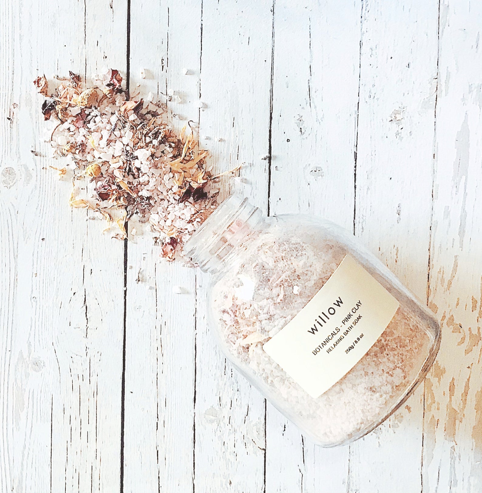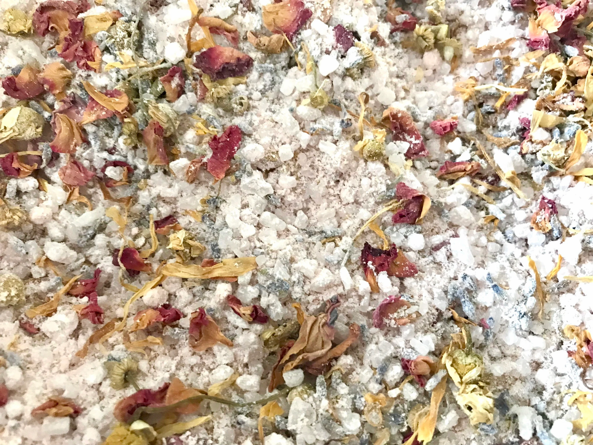 BOTANICALS + PINK CLAY - a relaxing blend of Himalayan Pink Salt, Sea Salt, Australian Pink Clay, Rose Petals, Lavender Buds, Calendula Petals and Chamomile Buds, that produces a beautiful dusty pink bath. Infused with Roman Chamomile and Lavender Essential Oils.